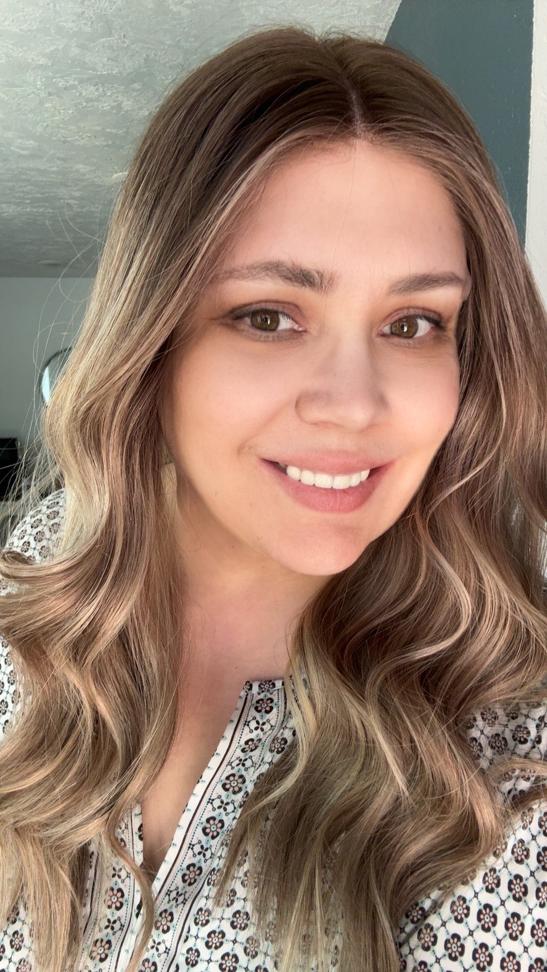 The beautiful dark blonde base gradually fades to a lighter blonde, with well-blended roots at a level six, which are mostly neutral but the highlights and Blue lights are on the warm side. The wig is showcased under two natural light settings, highlighting its realistic and versatile color.